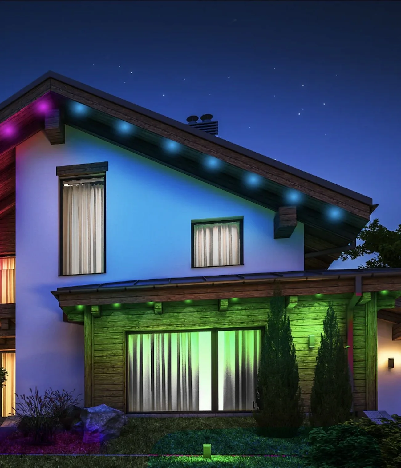Smart LED outdoor lighting enhances a home's aesthetic by creating a visually appealing and customizable ambiance. With adjustable colors, brightness levels, and automated scheduling, it highlights architectural features, pathways, and landscaping, adding depth and character to the exterior. Smart lighting also improves curb appeal and security while allowing homeowners to set the perfect mood for different occasions, from warm and inviting to vibrant and festive.